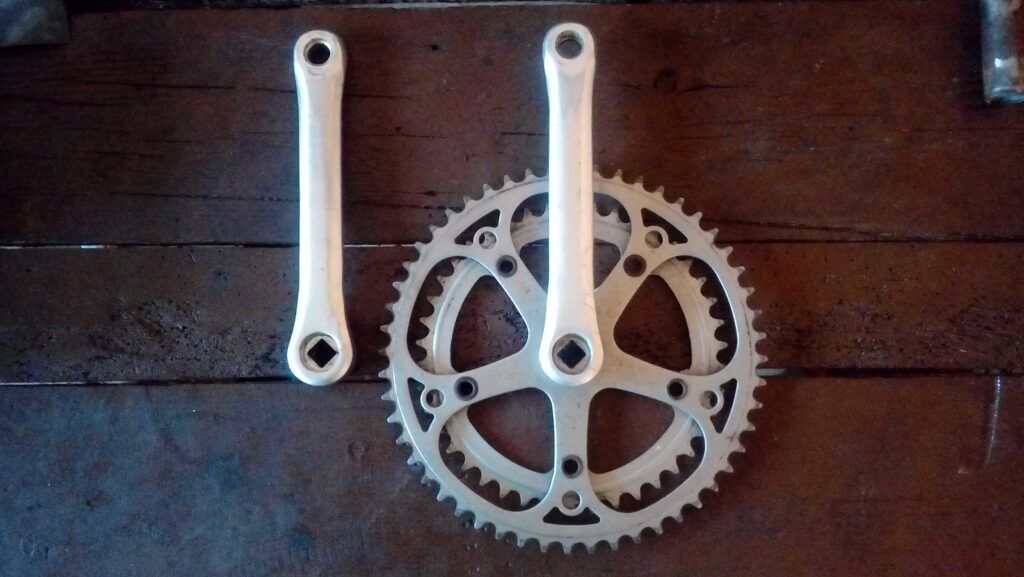 - Francuska korba – nie odgadnę marki, ale w tym przypadku Francja równa się oryginał. Zęby w dobrym stanie, trochę zarysowań, ale mało rzucających się w oczy. Na minus uszkodzone swoje gwintu do ściągacza. Wcześniej, by odkręcić pedały, również trzeba było się mocno zaprzeć.