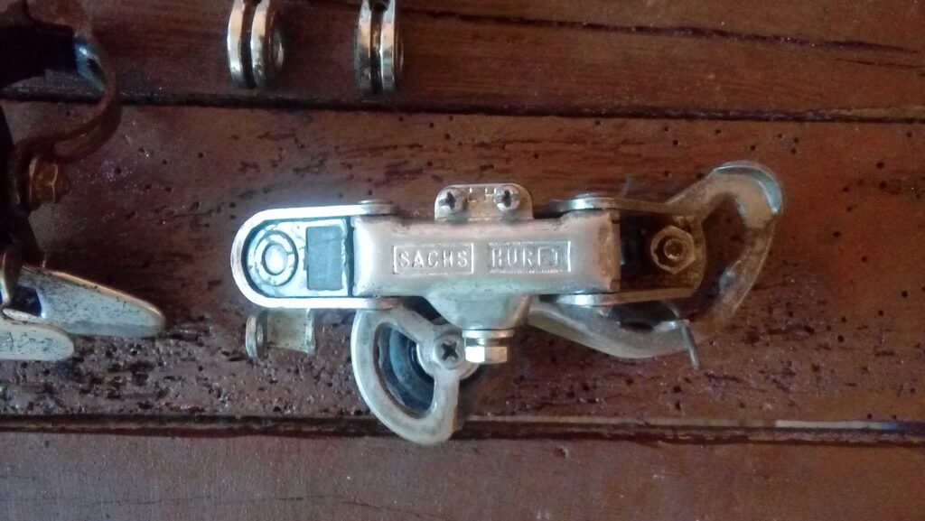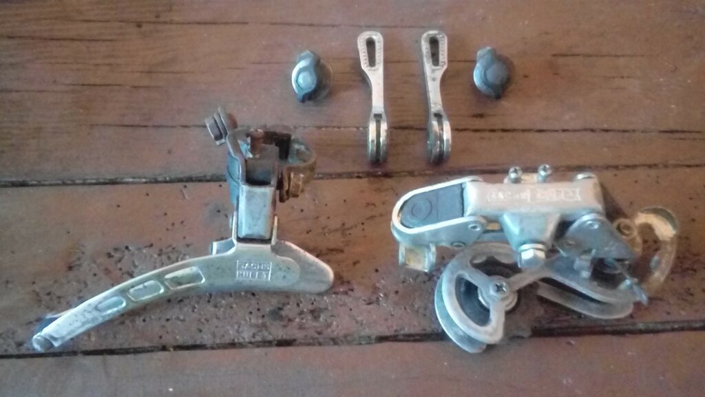 - Komplet francuskich przerzutek Sachs Huret oraz manetki przerzutek montowane na ramę również marki Sachs. Marka Sachs powstała w 1895 roku i odegrała znaczącą rolę w przemyśle rowerowym. W 1997 roku Sachs została przejęty przez popularnego SRAM-a, który dwa lata później przestał produkować części pod tą nazwą. Obecnie ceny tylnych przerzutek Sachs Huret wahają się za granicą od 50 do nawet 200 zł. Na zdjęciach przerzutki są już po czyszczeniu i renowacji. Niestety, szlifowanie i polerowanie jestem w stanie wykonać jedynie ręcznie, a to nie pozwala uzyskać efektu nowości.